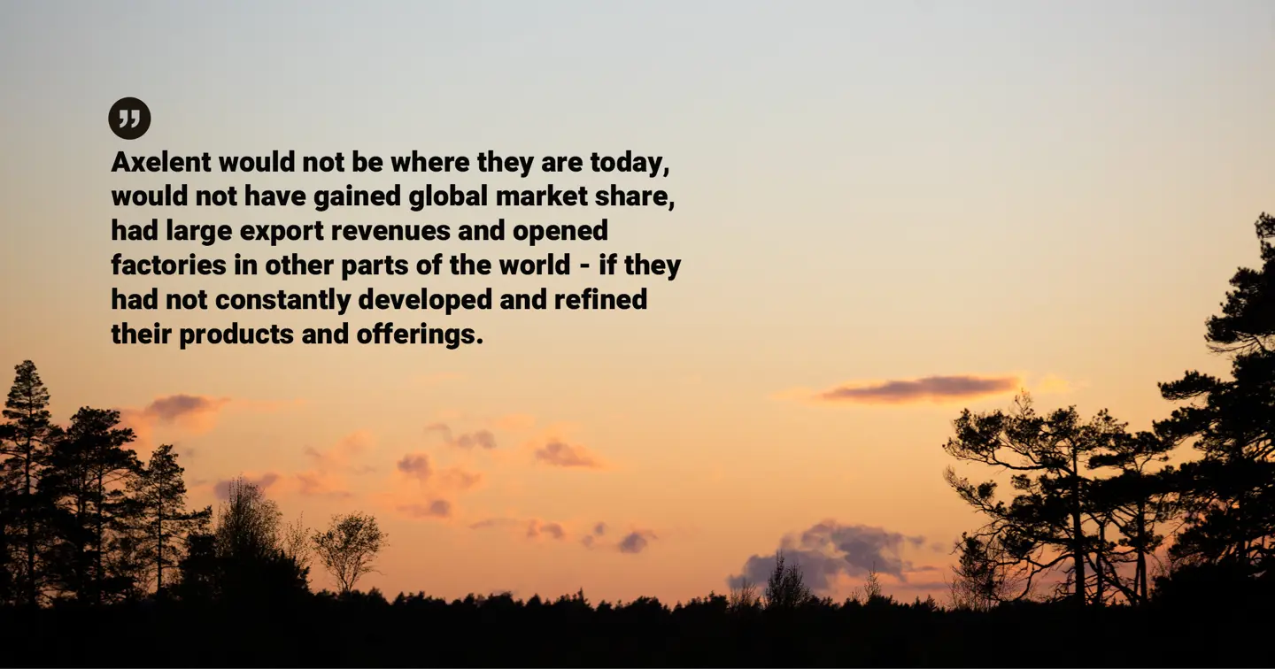 "There’s something special about companies like Axelent, where the founders are still actively working in the company. This means that values such as innovation and sustainability will have an impact on the entire operation. They would not have gained their global market share, had their large export revenues and opened factories in other parts of the world, if they had not constantly developed and refined their products and offerings.